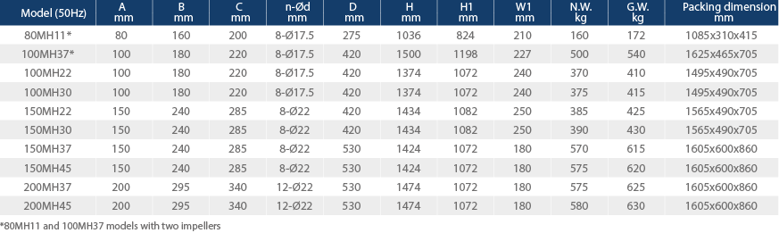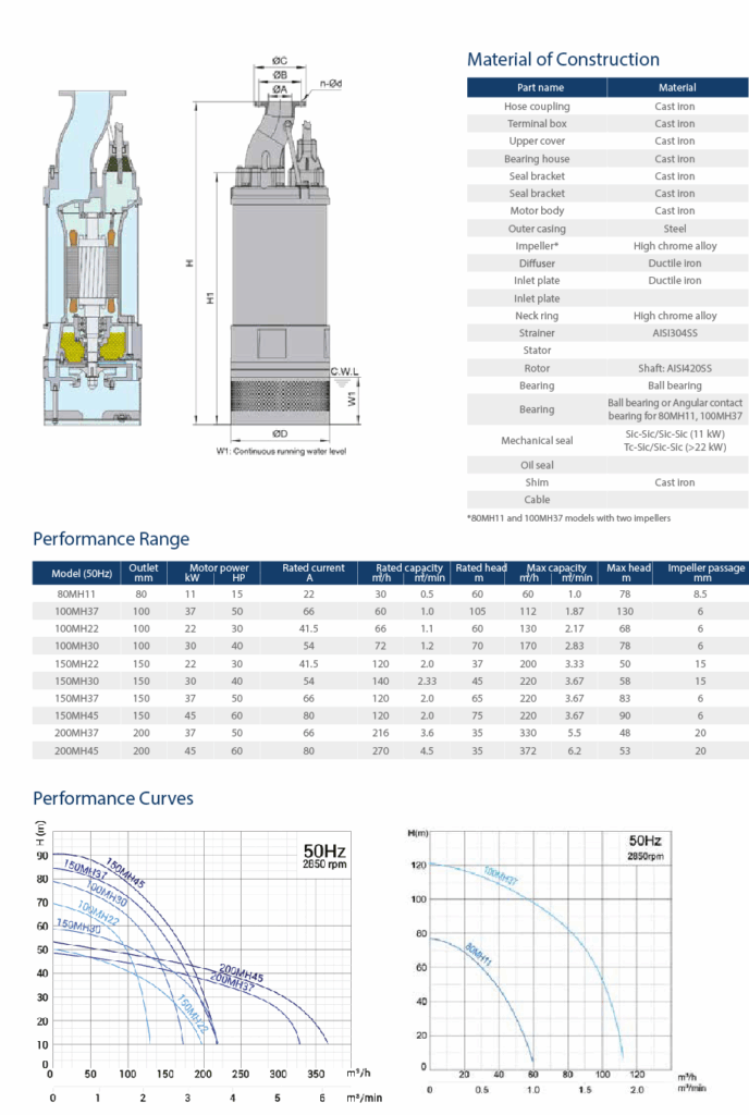 Размерите на изхода варират от 80 mm до 200 mm, а размерите на двигателя варират от 11 kW до 45 kW. Помпите са оборудвани с сухи потопяеми асинхронни двигатели (2 полюса).