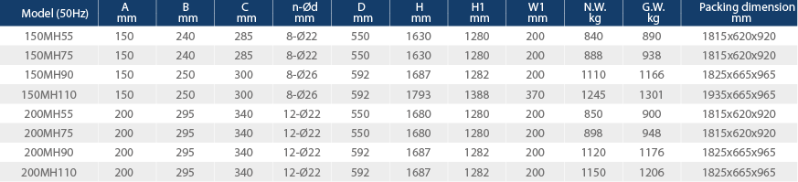 Размерите на изхода варират от 150 mm до 200 mm, а размерите на двигателя варират от 55 kW до 110 kW. Помпата е оборудвана с сух потопяем асинхронен двигател (2 полюса).