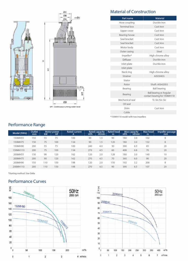 Потопяемите помпи от серията MH с здрава конструкция са проектирани да издържат на високото налягане при изпомпване на вода от дълбоки кладенци. Двигателят и корпусът на помпата са изработени от твърда чугунена отливка за дълготрайна издръжливост.