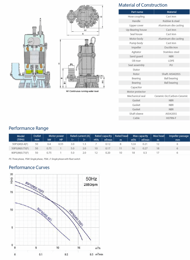 Преносимите дренажни помпи от серията PSM са оборудвани с полувихрови ротори и вградени бъркалки, закрепени към вала. Тези характеристики спомагат за ефективното изпомпване на замърсена вода и намаляват риска от запушване по време на работа.