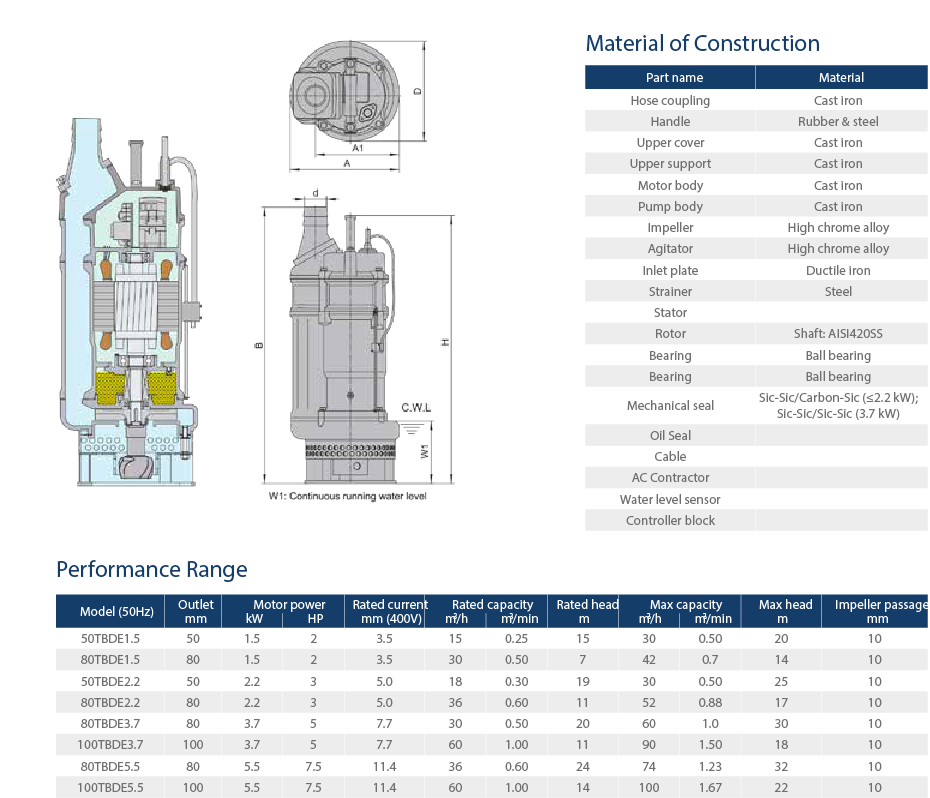 Помпите TBDE са идеални за прехвърляне на вода, съдържаща пясък и бентонитова каша, което ги прави подходящи за сонди, източване на вода, замърсена с каша, в строителни проекти и почистване на пясъчни кариери, наред с други приложения.