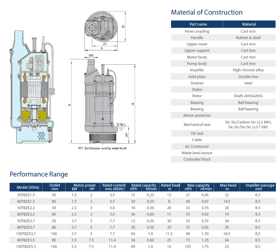 Двигателят и корпусът на помпата са изработени от издръжлива чугунена отливка, което гарантира дълготрайна работа. Механичното уплътнение, устойчиво на високо налягане, позволява по-дълбоко потапяне. Полуотвореното работно колело, изработено от сплав с високо съдържание на хром, работи заедно с износоустойчива плоча от ковък чугун, за да осигури изключителна издръжливост.