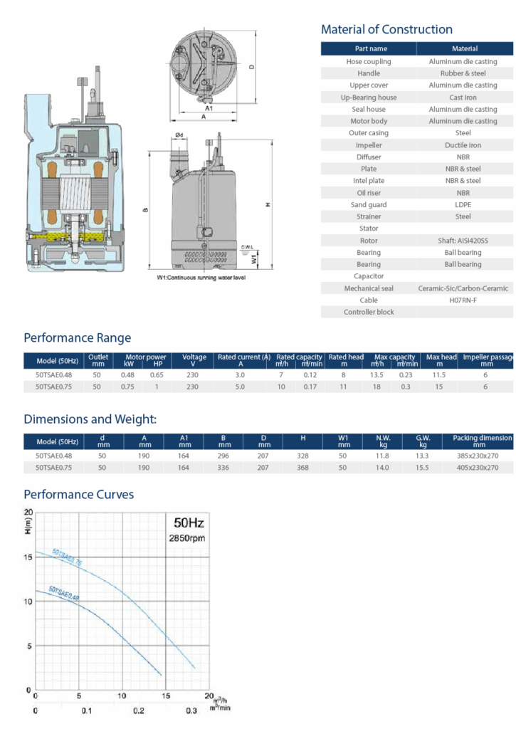 Преносимите дренажни помпи от серията TSAE са с горно изпускане за ефективно охлаждане и компактен дизайн. Тези компактни и здрави помпи могат да се използват за различни строителни отводнявания и други общи дренажни приложения.