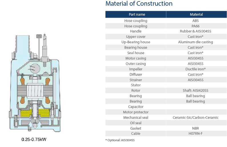 Корпусът на помпата и частите, които влизат в контакт с вода, са изработени от чугун или неръждаема стомана (по избор на клиента). В зависимост от приложението, помпите са оборудвани с полуотворено работно колело, изработено от сплав с високо съдържание на хром или неръждаема стомана.