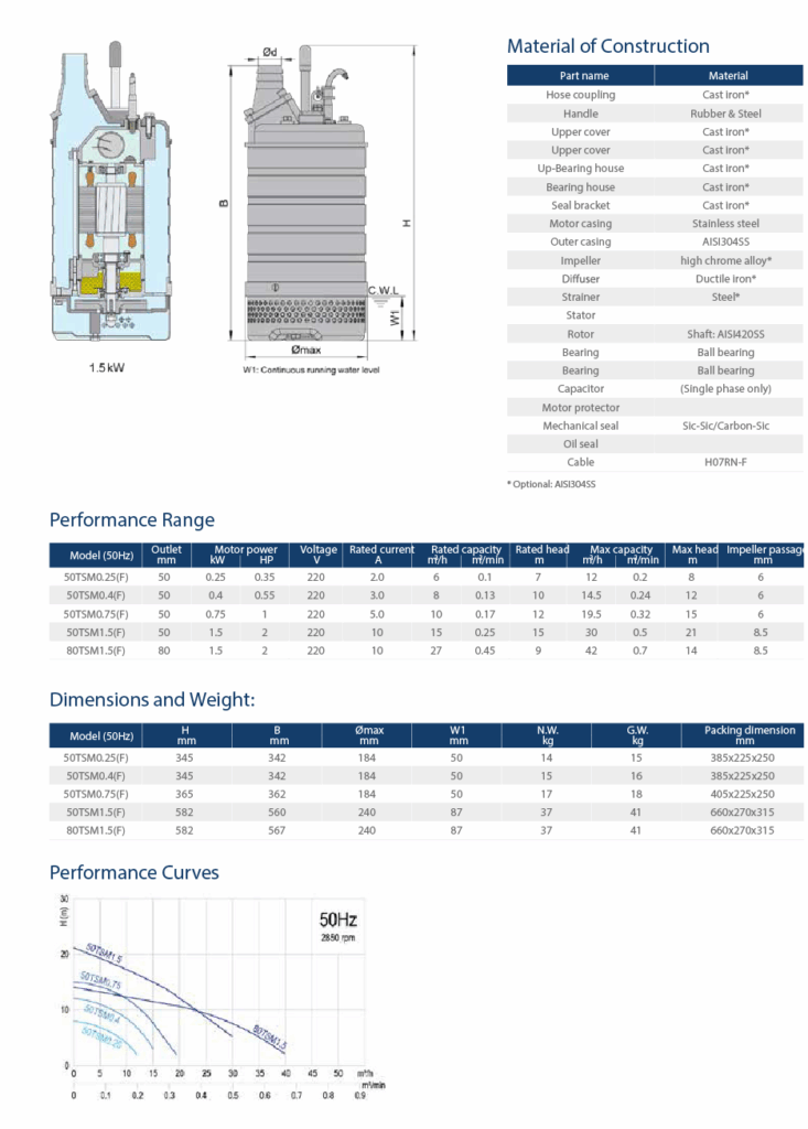 Помпите от серията TSM са компактни, високопроизводителни, издръжливи еднофазни потопяеми помпи, използвани за работа с абразивни и/или корозивни течности на тежки работни места, включително мини, промишлени предприятия, обществени услуги и строителни обекти.