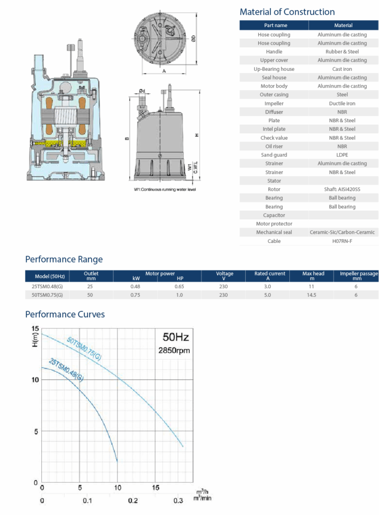 Серията TSM(G) са преносими помпи за отводняване на остатъци, способни да изпомпват вода до пода, което позволява дори и най-малката локва да бъде изпомпана. Помпите TSM(G) са идеални за пълно изпомпване на плоски повърхности, където няма резервоар, като мазета, паркинги, пътища и басейни. Тези помпи могат да изпомпват вода непрекъснато на дълбочина 1 mm и са оборудвани с клапан, който предотвратява обратния поток на изсмуканата вода, когато помпата спре да работи.