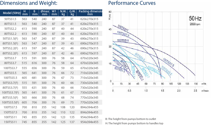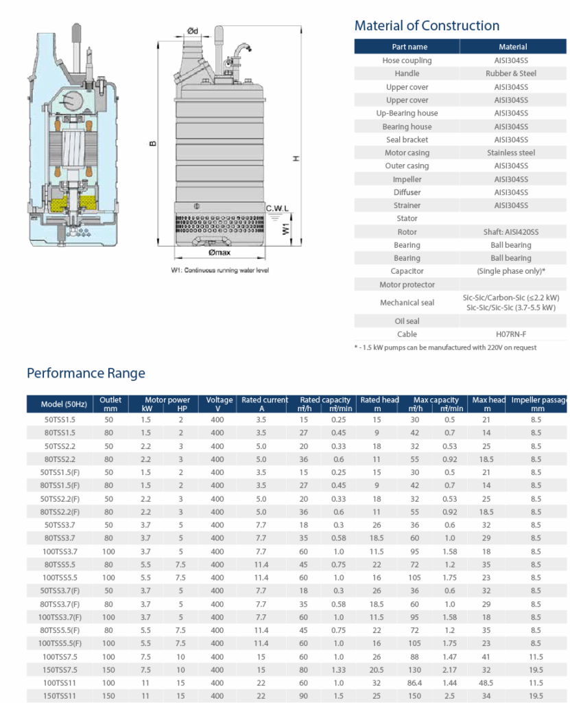 Потопяемите помпи от серия TSS от неръждаема стомана се използват за транспортиране на химически агресивни и абразивни течности в минни и промишлени обекти. Всички части на помпите, които влизат в контакт с вода, са изработени от неръждаема стомана.